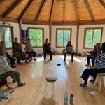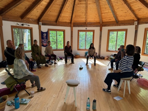 It was a bit of a grey day in May of 2025 that I found myself sitting in an arched position on a uniquely crafted stool in a beautiful maloca on Crystal Mountain near Nelson, British Columbia emitting “aaaah” sounds with the support and encouragement of Elisabeth Baile of France. I had received an email flyer some months earlier for a workshop entitled “Chant Postural”. Despite not having a clear understanding of what the workshop was about, something drew me in and I had registered.