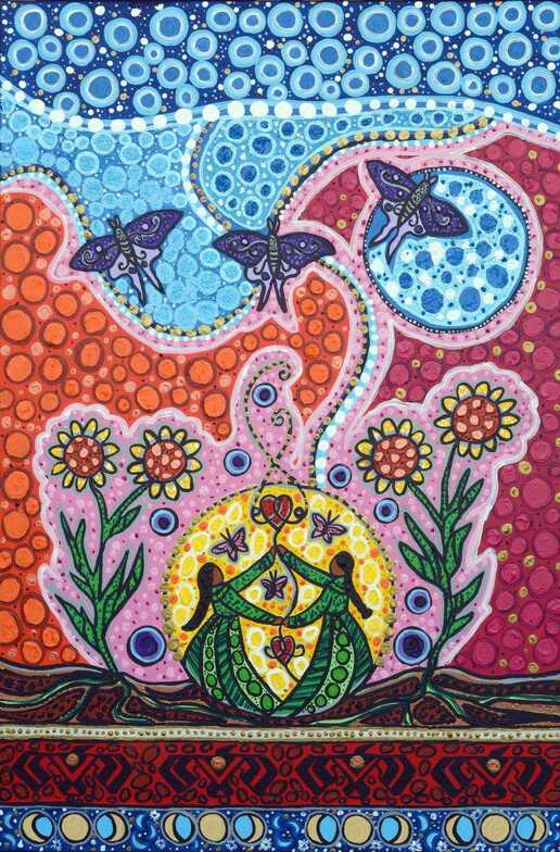 Her work, along with Wanuskewin's Artist-in-Residence Aby Whitecalf, is featured in an exhibit at Wanuskewin Heritage Park from November 17th to February of 2022. In the exhibit entitiled Thirteen Moons, Métis artist Leah Dorion shares the moon teachings through her detailed painting and poetry. Important to Indigenous women’s wisdom and traditional cultural knowledge, the moon teachings honour women as vital life-givers.